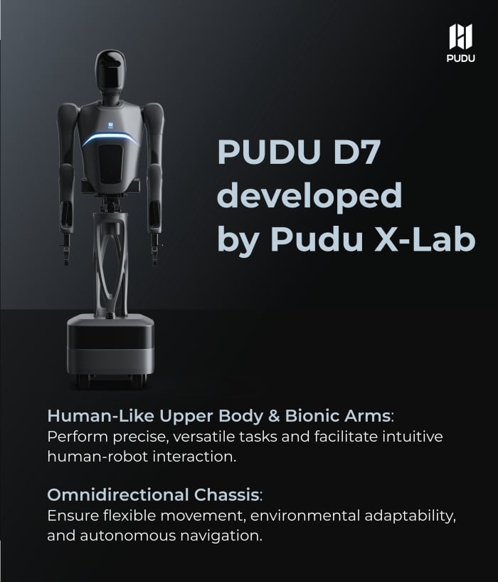 eine zukunftsweisende Innovation mit beeindruckender Mobilität, Geschicklichkeit und verkörperter Intelligenz. Der D7 kombiniert einen menschen-ähnlichen Oberkörper mit einem omnidirektionalen Fahrwerk und meistert dadurch komplexe Aufgaben in unterschiedlichsten Umgebungen.